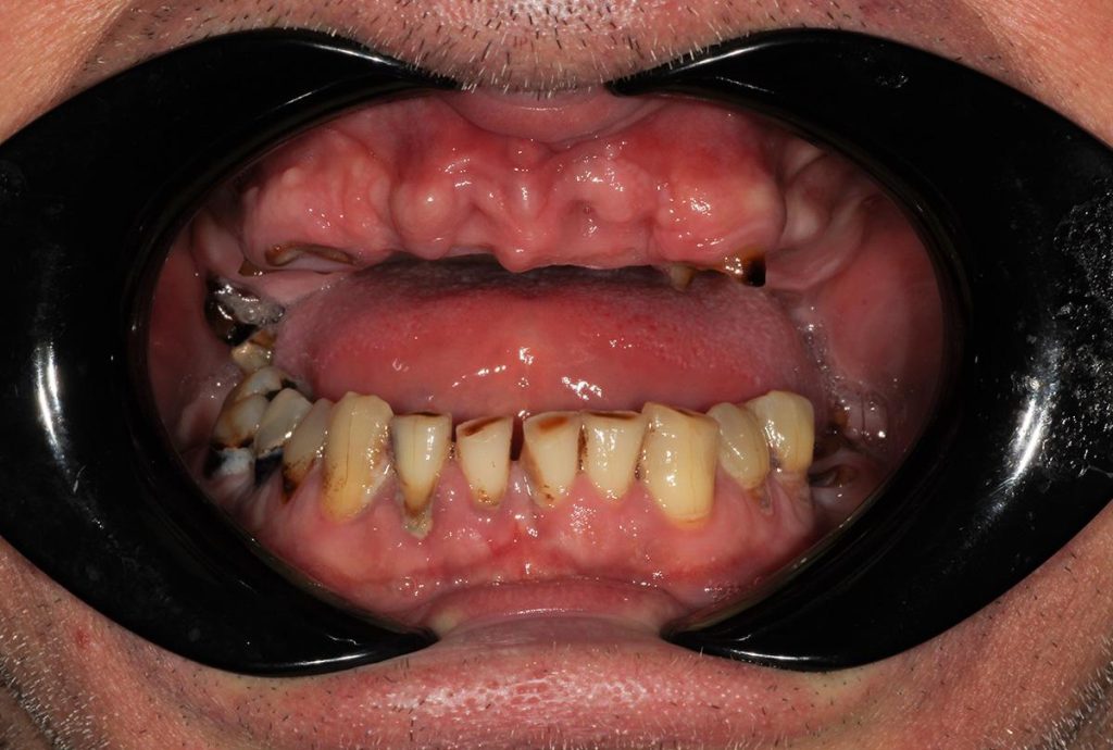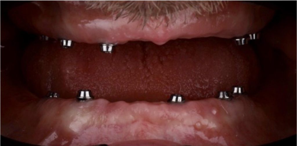Przeprowadziliśmy precyzyjne leczenie implantologiczne, wszczepiając 11 implantów w szczęce i żuchwie. Konieczna była też regeneracja kości. Po 6 miesiącach gojenia nastąpiła odbudowa pełnołukowa. Kształt, kolor i ustawienie zębów zostały dobrane oraz wykonane na indywidualne życzenie Pacjenta.