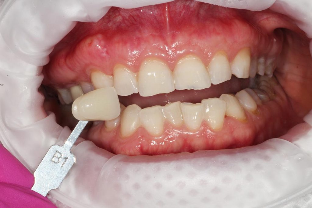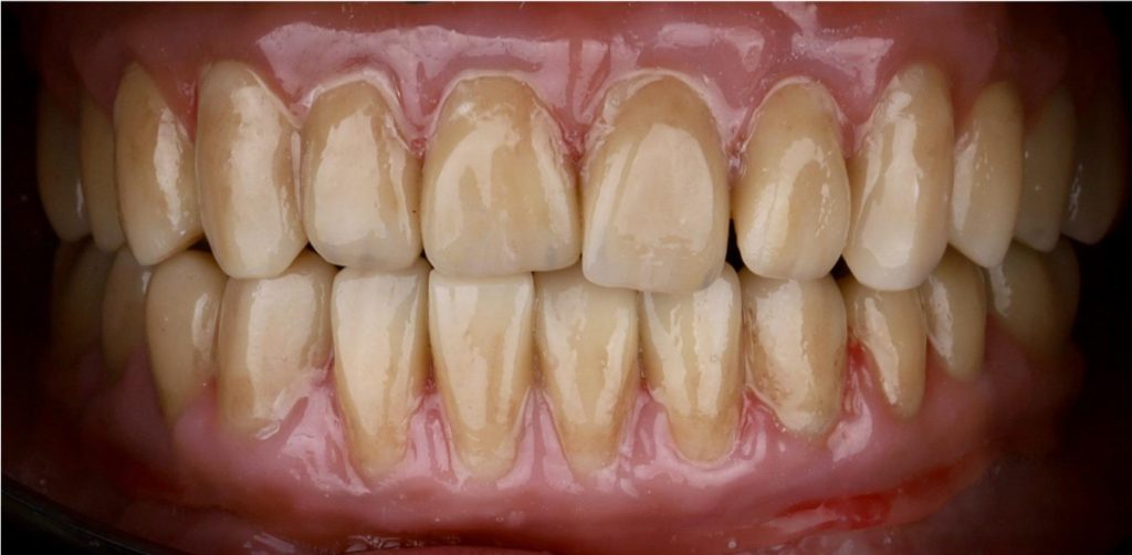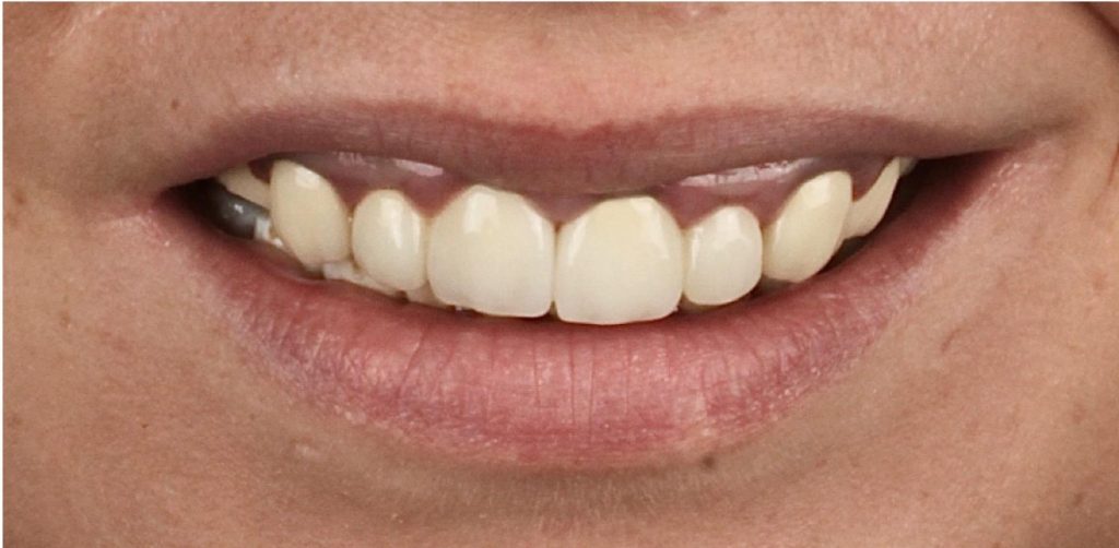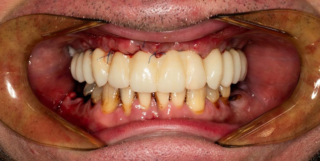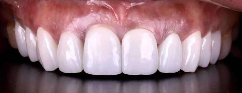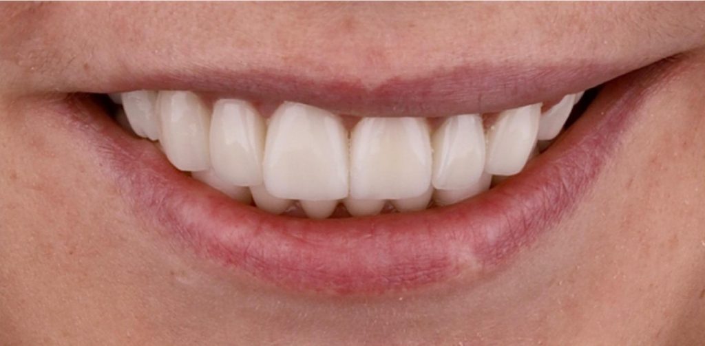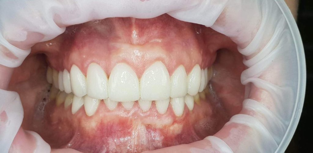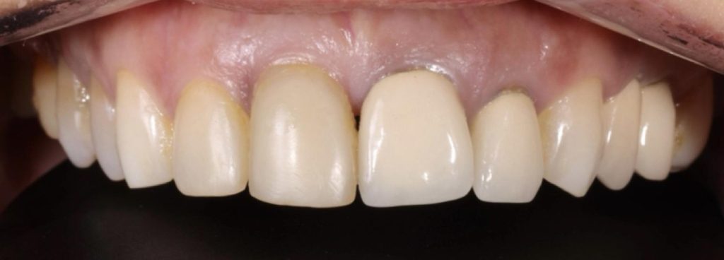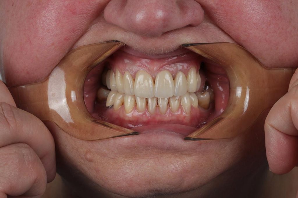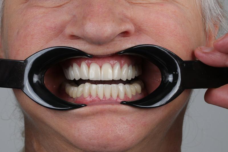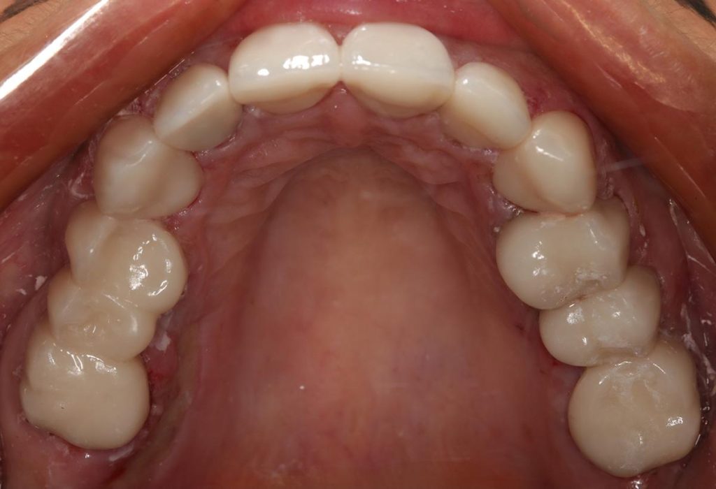 Praca została zwieńczona odbudową zębów koronami cyrkonowymi. Brakujący ząb, którego nie można było uzupełnić implantem z powodu za małej ilości miejsca, odtworzono za pomocą cyrkonowego mostu.