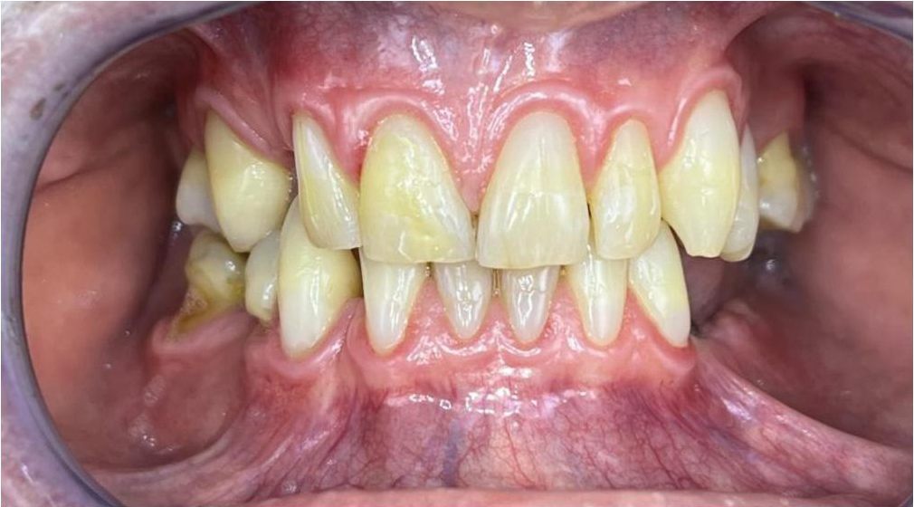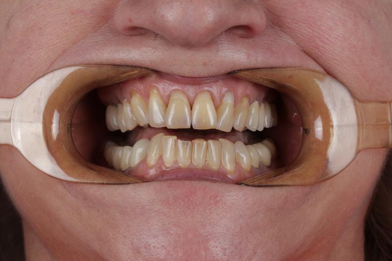 Pacjentka, zgłaszając się już na kolejną wizytę świadomie podjęła opcję pośrednią z proponowanych działań: wyleczenie zębów zachowawczo, endodontycznie z zabezpieczeniem protetycznym, estetyczne korekty uśmiechu licówkami, ćwierćkoronami i koronami, jednak bez pełnej przebudowy zwarcia (z zachowaniem starszych odbudów w strefach bocznych, które były wykonane na implantach w przeszłości), która jest zawsze najbardziej polecana, odtwarza prawidłowe kontakty, a także umożliwia lekarzowi i technikowi najlepsze warunki do nadania odpowiednich i harmonijnych kształtów. Te wszystkie działania chronią na przyszłość staw skroniowo-żuchwowy.