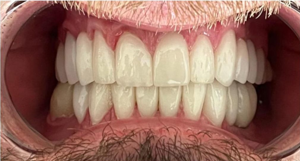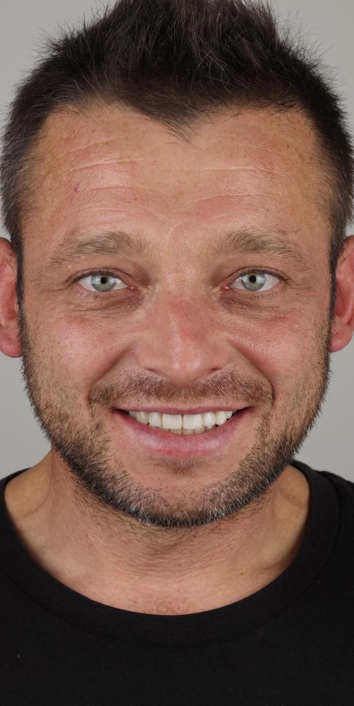 Cała metamorfoza zajęła zaledwie 2,5 godziny – 2 godziny na zabieg wszczepiania implantów i 30 minut na montaż nowego kompletu zębów następnego dnia. Dzięki temu podejściu „dziś implanty – jutro zęby” szybko i bezpiecznie przywróciliśmy uśmiech naszego Pacjenta, minimalizując przy tym ryzyko i dyskomfort.