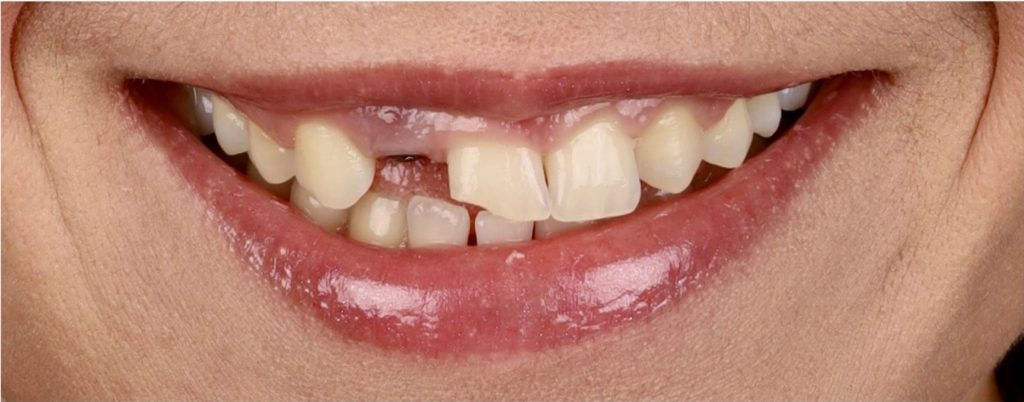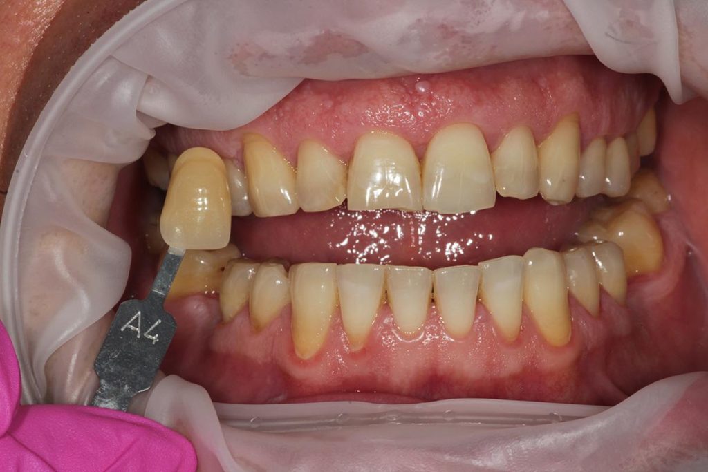 Aby osiągnąć taki efekt, musieliśmy przeprowadzić ekstrakcję złamanej górnej jedynki i w jej miejsce jednoczasowo wszczepić implant, a następnie na pozostałe zęby wykonać licówki i korony pełnoceramiczne w najjaśniejszym odcieniu.