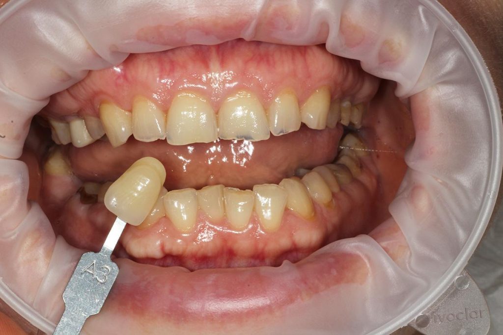 Wykonano odbudowę koronami cyrkonowymi, dla harmonii włączono w pracę również prawą dwójkę.